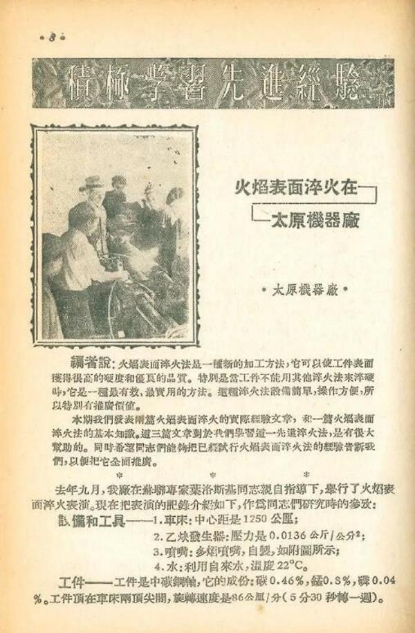 圖2 新中國第一個重型機器廠——太原重型機器廠 劉鼎、支秉淵與太重的建設 在太重的創建過程中,新中國機械工業卓越領導者之一的劉鼎起到了重要的作用。 據李滔等著的《劉鼎》一書中記載,新中國成立后,為即將展開的大規模經濟建設服務,中央組織了由中央重工業部副部長劉鼎任團長的重工業考察團前往東北、上海等地考察重工業。在上海參觀時,劉鼎注意到日本賠償物資中的大型水壓機、重型機床和龍門刨床等重型設備很適合重機廠使用。1950年初他在太原考察時,看到太原汾河西岸萬柏林一帶很適合作為重機廠的廠址。在人力方面,他考慮到華東有一批工廠管理經驗豐富的干部,上海著名的機械專家支秉淵也曾經表示可以大力支持技術骨干。綜合上述條件,“一個在太原萬柏林新建一個重型機器廠的設想與規劃,就在劉鼎的頭腦中逐漸醞釀成熟了。”劉鼎向中央匯報了這一設想,經批準成立了太原重型機械廠籌建處,鄭漢濤為主任,支秉淵為副主任。“太原重型機器廠從設計、土建施工、設備的采購與調撥以及非標準設備的設計和制造等各項工作,都是由中國人獨立自主自行完成的……劉鼎在這項工作中既是策劃人,又是組織領導者,可謂功不可沒。” 在太重的創建過程中,支秉淵也是一位貢獻卓著的前輩。支秉淵的一生為我國機械工程技術的發展作出了卓越的貢獻, 被稱為“近代中國機械工業奠基人之一”。據中國科學技術協會組織編纂的《中國科學技術專家傳略》記載,新中國成立后,支秉淵任華東工業部機械處處長。中央決定興建太重后,支秉淵任籌建處副主任,后任太重副廠長兼總工程師。在支秉淵等宣傳動員下,在上海聘到了近百名技術人員和技術工人。在他的主持下,上海各界全力支持,40多位知名工程師和大學教授紛紛加入設計隊伍,僅用40天就完成了規劃文件。太重的建成凝聚著支秉淵等專家的心血和汗水。 與太重同齡,記錄建設畫面 作為與太重同齡的老牌雜志,《機械工人》記錄下了太重創建過程中的珍貴畫面,如興建中的太重鑄鋼車間,初加工車間安裝新式鉆床和龍門刨床、鍛造車間技術工人工作,蘇聯專家進行技術指導等場景(見圖1、圖2),雜志上的技術文章還詳細介紹了火焰表面淬火在太重應用的先進經驗(見圖3), 這些都是我們重溫建國初期前輩們風風火火興建太重的歷史畫面。
