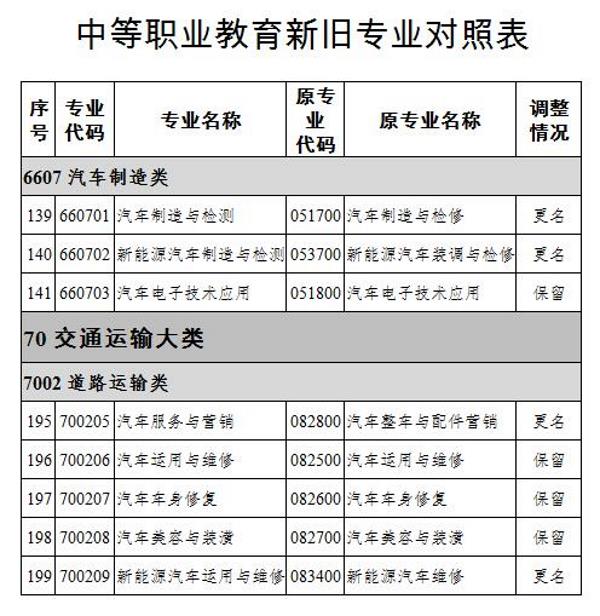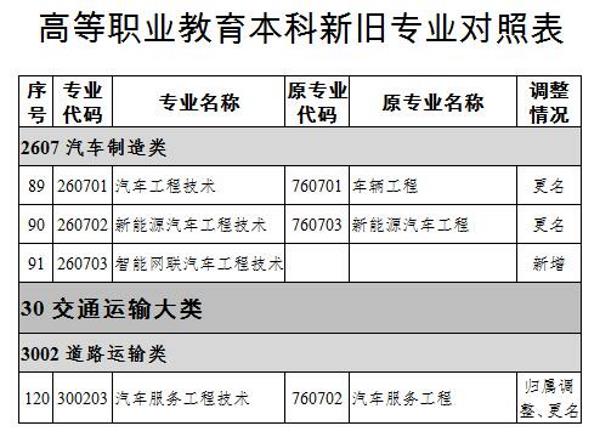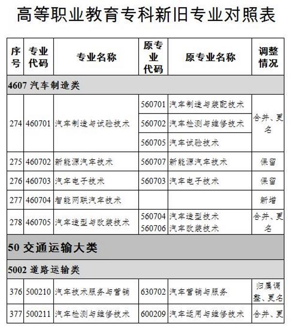 在高等職業教育?茖I目錄中,“汽車制造與裝配技術”、“汽車檢測與維修技術”和“汽車試驗技術”合并為“汽車制造與試驗技術”;新增了“智能網聯汽車技術”;“汽車造型技術”和“汽車改裝技術”合并為“汽車造型與改裝技術”;“汽車營銷與服務”更名為“汽車技術服務與營銷”并進行了歸屬調整;“汽車運用與維修技術”、“汽車車身維修技術”和“汽車運用安全管理”合并為“汽車檢測與維修技術”;“新能源汽車運用與維修”更名為“新能源汽車檢測與維修技術”。