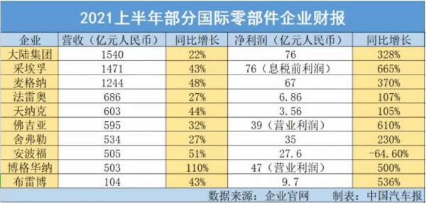 兩位數甚至三位數的利潤和營收增長成為上半年國際零部件企業的常態。近日,大陸集團、佛吉亞、法雷奧、舍弗勒、博格華納等多家知名零部件企業陸續公布了第二季度及上半年財報。