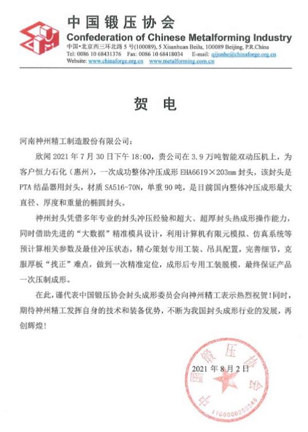 這一“破紀(jì)錄”產(chǎn)品,獲得了“官方認(rèn)證”。8月7日,記者從神州精工獲悉,中國鍛壓協(xié)會、中國國際金屬成形展覽會為此專門發(fā)來的賀電,熱烈祝賀該企業(yè)成功整體沖壓成形目前國內(nèi)最大直徑、厚度和重量的橢圓封頭。