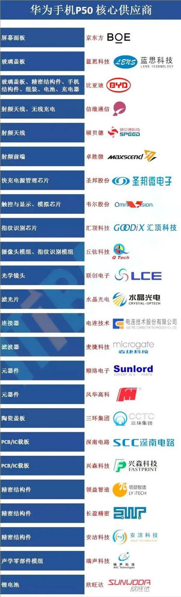 2021年3月,Mate40E中國產零組件占比已經接近60%; 2021年7月,媒體爆料華為手機國內供應鏈再次擴充,并給出一張參考圖。