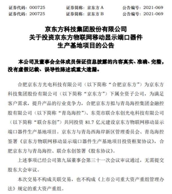 在中國(guó)如今的半導(dǎo)體顯示領(lǐng)域,京東方科技集團(tuán)股份有限公司(以下簡(jiǎn)稱“京東方”)無(wú)疑撐起了一片天,并以超過(guò)30%的份額在世界范圍內(nèi)占有一席之地。 ![]() 近年來(lái),京東方帶領(lǐng)著中國(guó)顯示產(chǎn)業(yè)一步步走向強(qiáng)大,很大程度上改善了中國(guó)缺“芯”少“屏”的沉疴,其擴(kuò)產(chǎn)之路也從未停歇,并開(kāi)啟了遍布全國(guó)的深度布局。 8月30日晚,京東方發(fā)布公告,將在青島西海岸新區(qū)投資建設(shè)全球最大的移動(dòng)顯示模組單體工廠。 眾所周知,青島擁有海爾海信澳柯瑪(5.960, 0.05, 0.85%)等眾多家電知名品牌,無(wú)論是“芯”還是“屏”都有著巨大的市場(chǎng)需求,京東方的落地在補(bǔ)齊發(fā)展短板的同時(shí),也將完善產(chǎn)業(yè)鏈,賦能青島先進(jìn)制造業(yè)發(fā)展。 那么,兩者牽手共進(jìn),又將會(huì)激蕩起怎樣的“漣漪”? ![]() 投資81.7億!京東方工廠落戶青島 8月30日晚,京東方發(fā)布公告,將在青島西海岸新區(qū)投資建設(shè)全球最大的移動(dòng)顯示模組單體工廠。 根據(jù)公告內(nèi)容,京東方下屬全資子公司合肥京東方擬與青島海控、聯(lián)合東創(chuàng)共同投資81.7億元建設(shè)京東方物聯(lián)網(wǎng)移動(dòng)顯示端口器件生產(chǎn)基地項(xiàng)目。 與此同時(shí),京東方與青島西海岸新區(qū)管理委員會(huì)、青島海控簽署《京東方物聯(lián)網(wǎng)移動(dòng)顯示端口器件生產(chǎn)基地項(xiàng)目投資框架協(xié)議》,合肥京東方與青島海控、聯(lián)合東創(chuàng)簽署《股東協(xié)議》。 據(jù)悉,京東方物聯(lián)網(wǎng)移動(dòng)顯示端口器件生產(chǎn)基地項(xiàng)目占地約800畝,擬選址王臺(tái)新動(dòng)能產(chǎn)業(yè)基地,將新建全自動(dòng)模組生產(chǎn)線,主要生產(chǎn)手機(jī)屏幕、Pad顯示屏幕、筆記本顯示屏幕等移動(dòng)顯示系統(tǒng)用平板顯示器,后續(xù)將延伸手機(jī)整機(jī)及設(shè)備自制業(yè)務(wù)。 本次項(xiàng)目建設(shè)周期為18個(gè)月。項(xiàng)目注冊(cè)資本為50億元,其中,合肥京東方現(xiàn)金出資32.5億元,青島海控以自有資金出資15億元,聯(lián)合東創(chuàng)以自有資金出資2.5億元。 作為深耕于顯示器產(chǎn)品行業(yè)的知名企業(yè),京東方創(chuàng)立于1993年4月,是一家為信息交互和人類健康提供智慧端口產(chǎn)品和專業(yè)服務(wù)的物聯(lián)網(wǎng)公司,其核心業(yè)務(wù)包括端口器件、智慧物聯(lián)、智慧醫(yī)工。 而回看京東方與青島的相識(shí)相知,也為兩者的最終牽手埋下了伏筆。 自2019年,青島引進(jìn)京東方(青島)智慧系統(tǒng)創(chuàng)新中心項(xiàng)目落地西海岸新區(qū)以來(lái),引入京東方及相關(guān)企業(yè)100余家。2020年1月,京東方科技集團(tuán)在青島注冊(cè)全資子公司“青島京東方智慧系統(tǒng)創(chuàng)新中心有限公司”,2020年12月改名為“青島京東方智慧科技有限公司。”2021年6月發(fā)布的京東方春季招聘簡(jiǎn)章顯示,青島基地將首次開(kāi)啟招聘,項(xiàng)目推進(jìn)正穩(wěn)步進(jìn)行,直至此次最終落地。 不難看出,京東方一直持續(xù)加碼在青島的產(chǎn)業(yè)布局力度。 多區(qū)域深度布局,京東方有何魅力? 經(jīng)過(guò)多年的深耕布局,京東方現(xiàn)已發(fā)展成為全球半導(dǎo)體顯示龍頭企業(yè),在顯示領(lǐng)域的市占率、出貨量連續(xù)多年穩(wěn)居全球第一。 目前,京東方子公司遍布德國(guó)、英國(guó)、法國(guó)、瑞士、日本、韓國(guó)等19個(gè)國(guó)家和地區(qū),服務(wù)體系覆蓋歐、美、亞、非等全球主要地區(qū)。在國(guó)內(nèi)北京、成都、綿陽(yáng)、合肥、鄂爾多斯(32.990, -2.28, -6.46%)、重慶、福州、武漢等地?fù)碛?4條半導(dǎo)體顯示生產(chǎn)線。 8月30日,京東方發(fā)布了2021年半年度報(bào)告,上半年歸屬于母公司所有者的凈利潤(rùn)127.62億元,同比增長(zhǎng)1023.96%;營(yíng)業(yè)收入1072.85億元,同比增長(zhǎng)89.04%;基本每股收益0.363元。截止報(bào)告期末,京東方凈資產(chǎn)為1858.95億元,與去年同期相比增長(zhǎng)7.20%。 由此來(lái)看,無(wú)論是從業(yè)績(jī),所從事的行業(yè),還是影響力京東方都是一個(gè)可以帶動(dòng)地方高質(zhì)量發(fā)展的重要引擎。 如今,這家面板行業(yè)巨頭為何選擇走進(jìn)青島? 首先從產(chǎn)業(yè)基礎(chǔ)來(lái)講,青島先進(jìn)制造業(yè)基礎(chǔ)雄厚、體系健全,同時(shí)也是國(guó)內(nèi)重要的電視整機(jī)生產(chǎn)基地,具有海爾海信等眾多知名家電品牌。2020年,全市電視機(jī)產(chǎn)量1774.9萬(wàn)臺(tái)。青島正處于快速發(fā)展的階段的新能源汽車、軌交制造等產(chǎn)業(yè),也都帶來(lái)了龐大的“屏”需求。 其次,則是青島滿滿的誠(chéng)意。政府部門的積極對(duì)接和爭(zhēng)取,釋放出了愿意一同與京東方攜手共進(jìn)的積極信號(hào)。早前,根據(jù)京東方披露非公開(kāi)發(fā)行A股股票發(fā)行情況報(bào)告書(shū)顯示,非公開(kāi)發(fā)行股票數(shù)量36.5億股,募集資金總額為203.33億元,20家機(jī)構(gòu)“爭(zhēng)相入局”,青島國(guó)資占兩席,足以看出青島對(duì)京東方的重視。 最后,項(xiàng)目之所以選擇青島西海岸新區(qū),主要因其擁有