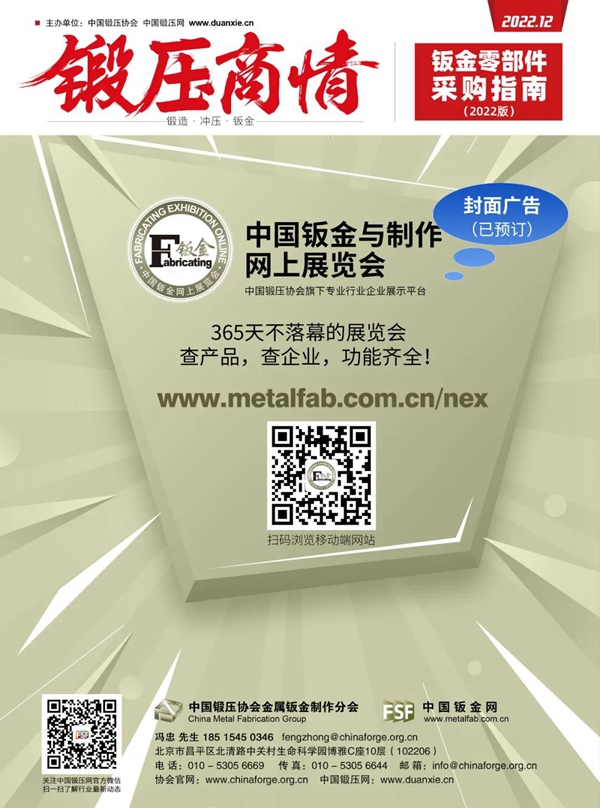 由中國鍛壓協會主辦的《鍛壓商情-鈑金制作零部件采購指南(2022版)》計劃于2022年12月出刊,計劃在上海金屬成形展和上海工博會期間大量發放。