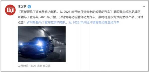 又一家車企宣布未來將成為電動汽車品牌。據(jù)外媒報道,英國豪華超跑品牌阿斯頓馬丁宣布從2026年開始,只銷售電動或混合動力汽車,屆時將逐步淘汰內(nèi)燃機(jī)產(chǎn)品。據(jù)英國《金融時報》,阿斯頓·馬丁CEO勞倫斯·斯特羅爾與汽車管理局對話時表示:“到2026年,我們將完全實(shí)現(xiàn)電氣化”。