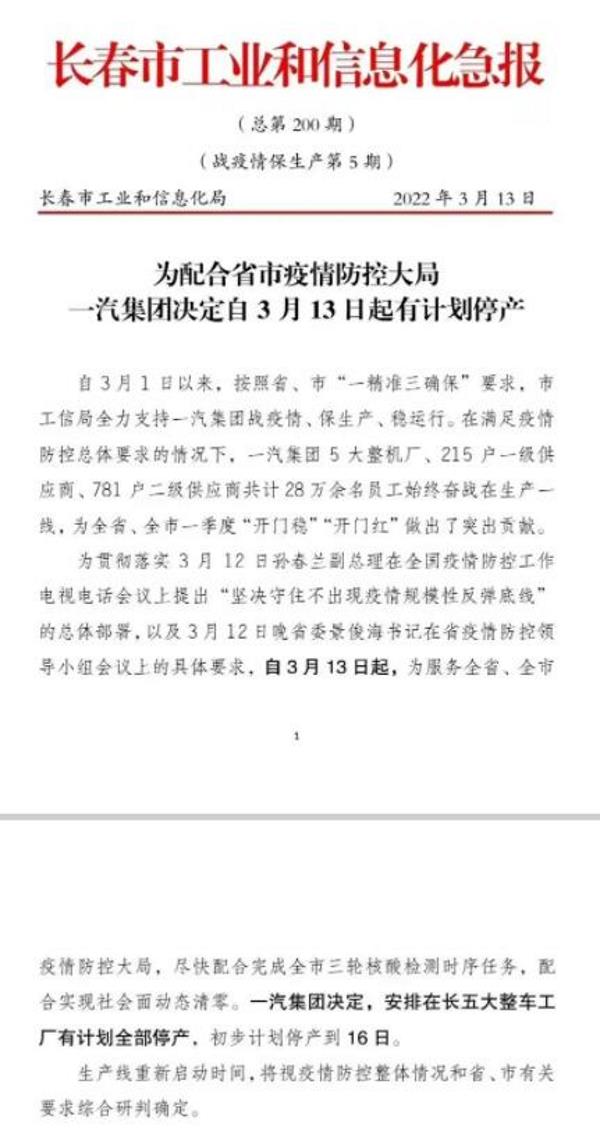日前,長春市工業(yè)和信息化局發(fā)布《為配合省市疫情防控大局,一汽集團(tuán)決定自3月13日起有計(jì)劃停產(chǎn)》文件。文件中指出,自3月13日起,為服務(wù)全省、全市疫情防控大局,盡快配合完成全市三輪核酸檢測時(shí)序任務(wù),配合實(shí)現(xiàn)社會(huì)面動(dòng)態(tài)清零。一汽集團(tuán)決定,安排在長五大整車工廠有計(jì)劃全部停產(chǎn),初步計(jì)劃停產(chǎn)到16日。生產(chǎn)線重新啟動(dòng)時(shí)間,將視疫情防控整體情況和省、市有關(guān)要求綜合研判確定。