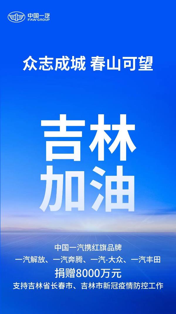 近期,吉林省部分地區(qū)相繼出現(xiàn)新冠肺炎疫情,長(zhǎng)春市、吉林市疫情防控形勢(shì)尤為嚴(yán)峻復(fù)雜。 中國(guó)一汽堅(jiān)決貫徹習(xí)近平總書(shū)記關(guān)于疫情防控工作的重要講話(huà)重要指示批示精神,認(rèn)真落實(shí)國(guó)務(wù)院聯(lián)防聯(lián)控機(jī)制關(guān)于疫情防控工作的最新要求,按照國(guó)務(wù)院國(guó)資委工作部署,堅(jiān)決落實(shí)地方黨委政府疫情防控要求,在做好自身防控的同時(shí),迅速行動(dòng),攜旗下紅旗品牌、一汽解放、一汽奔騰、一汽-大眾、一汽豐田共捐贈(zèng)現(xiàn)金8000萬(wàn)元,用于支持吉林省長(zhǎng)春市、吉林市疫情防控工作。