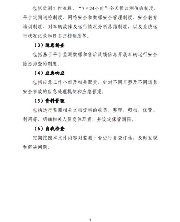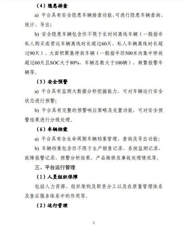 各省、自治區(qū)、直轄市及新疆生產建設兵團工業(yè)和信息化主管部門、公安廳(局)、交通運輸廳(局、委)、應急管理廳(局)、市場監(jiān)管局(廳、委),各省、自治區(qū)、直轄市通信管理局、消防救援總隊,新能源汽車企業(yè)和有關單位:為貫徹落實《新能源汽車產業(yè)發(fā)展規(guī)劃(2021-2035年)》(國辦發(fā)〔2020〕39號),進一步壓實新能源汽車企業(yè)安全主體責任,指導企業(yè)建立健全安全保障體系,現(xiàn)提出以下意見: 一、總體要求 堅持以習近平新時代中國特色社會主義思想為指導,完整、準確、全面貫徹新發(fā)展理念,統(tǒng)籌發(fā)展和安全,指導新能源汽車企業(yè)加快構建系統(tǒng)、科學、規(guī)范的安全體系,全面增強企業(yè)在安全管理機制、產品質量、運行監(jiān)測、售后服務、事故響應處置、網絡安全等方面的安全保障能力,提升新能源汽車安全水平,推動新能源汽車產業(yè)高質量發(fā)展。 二、完善安全管理機制 (一)強化組織保障。企業(yè)要明確新能源汽車安全管理的負責部門,統(tǒng)籌推進本企業(yè)安全體系建設。建立健全產品質量安全責任制,嚴格落實主要負責人、分管負責人和相關業(yè)務部門的產品質量安全責任。完善產品研發(fā)設計、生產制造、運行監(jiān)測、售后服務、事故響應處置、網絡安全等方面的安全管理制度規(guī)范。 (二)加強安全教育培訓。企業(yè)建立完善安全教育培訓制度,定期組織開展質量安全、網絡安全、消防安全等方面的教育培訓,提高工作人員安全意識和相關技能。 三、保障產品質量安全 (三)規(guī)范產品安全性設計。企業(yè)要制定產品安全性設計指導文件,并根據已銷售車輛暴露的安全問題持續(xù)修訂完善。安全性設計指導文件可細分為整車級、系統(tǒng)級、零部件級,包含但不限于整車功能安全、動力電池安全、使用操控安全、充換電安全、消防安全、網絡安全等。 (四)強化供應商管理。企業(yè)要對動力電池、驅動電機及整車控制系統(tǒng)等關鍵零部件供應商提出明確的產品安全指標要求,制定供應商質量體系評價制度,強化供應商評估。鼓勵關鍵零部件供應商積極配合開放與產品安全、質量分析等相關的必要數據協(xié)議。 (五)嚴格生產質量管控。企業(yè)要建立完備的生產信息化管理系統(tǒng),合理設置安全質量監(jiān)控節(jié)點,積極提高在線檢測能力。產品下線時按照標準要求開展涉水抽檢、路試抽檢,并重點開展整車絕緣、充放電、淋雨等測試,檢測數據存檔期限不低于產品預期生命周期。 (六)提高動力電池安全水平。企業(yè)要積極與動力電池供應商開展設計協(xié)同,持續(xù)優(yōu)化整車與動力電池的安全性匹配以及熱管理策略,明確動力電池使用安全邊界,提高動力電池在碰撞、振動、擠壓、浸水、充放電異常等狀態(tài)下的安全防護能力。鼓勵企業(yè)研究應用熱失控實時監(jiān)測預警裝置和早期抑制及滅火措施。 四、提高監(jiān)測平臺效能 (七)開展運行安全狀態(tài)監(jiān)測。企業(yè)要落實安全監(jiān)測主體責任,自建或委托第三方建立新能源汽車產品運行安全狀態(tài)監(jiān)測平臺(簡稱企業(yè)監(jiān)測平臺)。企業(yè)要按照與新能源汽車產品用戶的協(xié)議,對已銷售的新能源汽車產品的運行安全狀態(tài)進行監(jiān)測,并按照相關標準要求上傳監(jiān)測數據,確保上傳數據的及時性、真實性和有效性。監(jiān)測數據不得違法違規(guī)使用。 (八)強化運行數據分析挖掘。鼓勵企業(yè)加強對車輛運行數據的分析挖掘,梳理具有規(guī)律性、普遍性的安全問題并及時采取改進措施,持續(xù)優(yōu)化產品在不同場景下的安全性能。鼓勵積極研究應用先進安全預警方法,不斷提升新能源汽車安全預警能力。 (九)建立隱患車輛排查機制。鼓勵企業(yè)加強車輛運行安全狀態(tài)隱患排查,及時跟蹤和確認長時間離線車輛的安全狀態(tài),妥善處理大面積聚集停放、頻繁報警等存在安全隱患的車輛。 五、優(yōu)化售后服務能力 (十)加強服務網點建設。企業(yè)要合理布局售后服務網點和動力電池回收服務網點,不斷完善新能源汽車專用檢測工具與設備,提升服務人員安全服務意識,確保各服務網點具有必要的售后服務和應急處理能力。各服務網點要設置獨立的動力電池檢測維修區(qū)域,落實防火分隔措施,加強消防安全管理。 (十一)優(yōu)化維護保養(yǎng)服務。鼓勵企業(yè)細化產品維護保養(yǎng)項目,及時通知用戶進行維護保養(yǎng),在維修保養(yǎng)時加強關鍵零部件的質量檢測,并結合車輛使用年限、行駛里程、故障報警信息等開展安全隱患抽樣檢測,及時發(fā)現(xiàn)產品安全隱患并妥善處理。同時,企業(yè)要依法公開其生產車型的有關維修技術信息。 (十二)引導消費者合理使用車輛。鼓勵企業(yè)通過駕乘操作規(guī)范手冊、視頻等方式,引導消費者培養(yǎng)良好的用車養(yǎng)車習慣。明確告知消費者安全注意事項,指導消費者熟悉電池安全使用邊界、車輛可能出現(xiàn)的安全隱患及發(fā)生起火燃燒等事故的常見征象等,掌握逃生自救技能,妥善應對可能出現(xiàn)的安全事故。建立完善客戶檔案制度,確保及時精準確定缺陷汽車產品范圍。 六、加強事故響應處置 (十三)完善應急響應服務