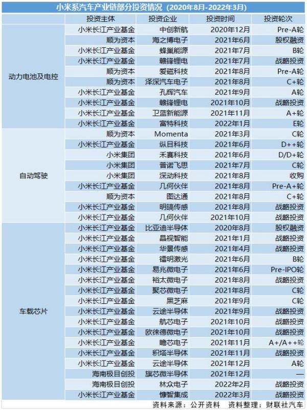 長江小米產業基金和順為資本是小米系重要的投資主體。據不完全統計,自去年以來,小米系資本在汽車產業鏈上的投資約40家。按照行業人士的說法,“小米在自動駕駛、車載芯片和動力電池領域的投資力度堪稱‘圈內之最’”。