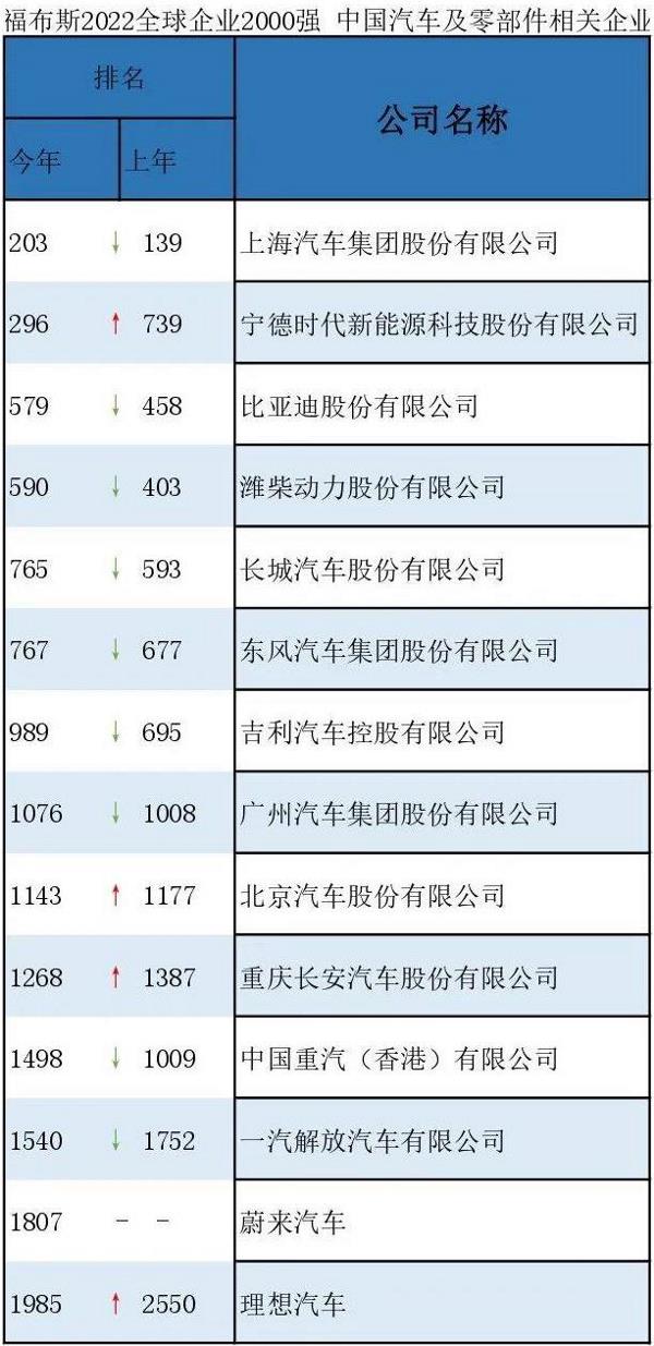 近日,福布斯發布2022全球企業2000強,399家中國企業上榜,較去年的395家有所上升。上汽集團、寧德時代、比亞迪汽車、濰柴動力、長城汽車等企業上榜。寧德時代從之前的第739位上升至第296位,蔚來汽車、理想汽車首次上榜。