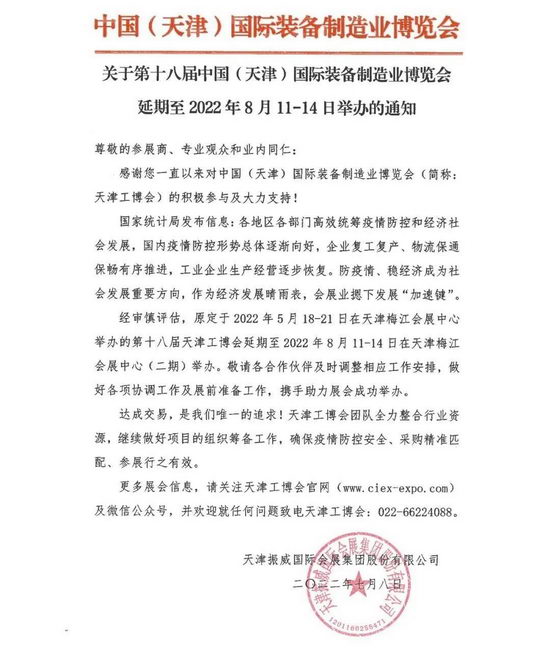 原定于2022年5月18-21日在天津梅江會展中心舉辦的第十八屆天津工博會延期至2022年8月11-14日在天津梅江會展中心(二期)舉辦。敬請各合作伙伴及時調整相應工作安排,做好各項協調工作及展前準備工作,攜手助力展會成功舉辦。