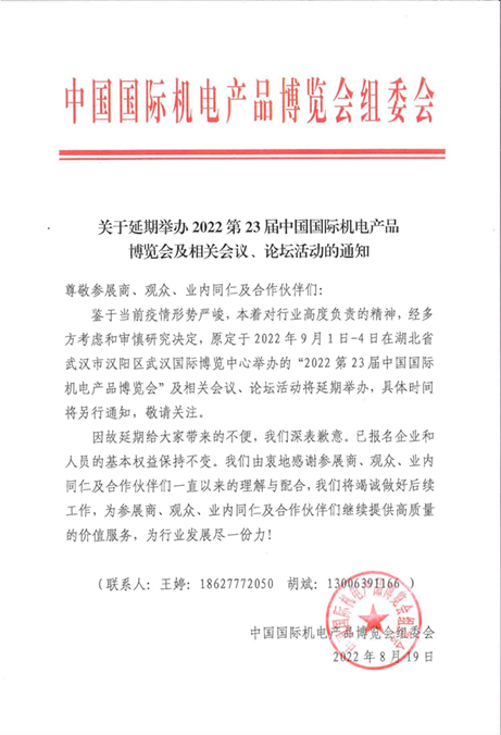 尊敬參展商、觀眾、業內同仁及合作伙伴們: 鑒于當前疫情形勢嚴峻,本著對行業高度負責的精神,經多方考慮和審慎研究決定,原定于2022年9月1日-4日在湖北省武漢市漢陽區武漢國際博覽中心舉辦的“2022第23屆中國國際機電產品博覽會”及相關會議、論壇活動將延期舉辦,具體時間將另行通知,敬請關注。 因故延期給大家帶來的不便,我們深表歉意。已報名企業和人員的基本權益保持不變。我們由衷地感謝參展商、觀眾、業內同仁及合作伙伴們一直以來的理解與配合,我們將竭誠做好后續工作,為參展商、觀眾、業內同仁及合作伙伴們繼續提供高質量的價值服務,為行業發展盡一份力!