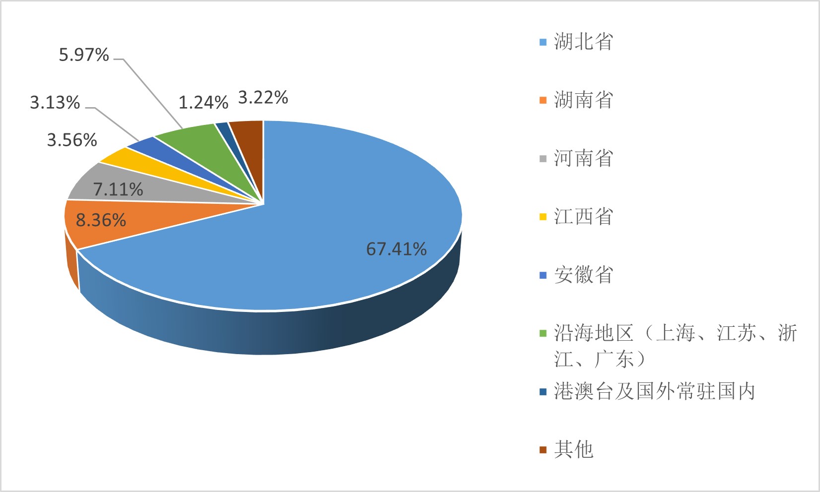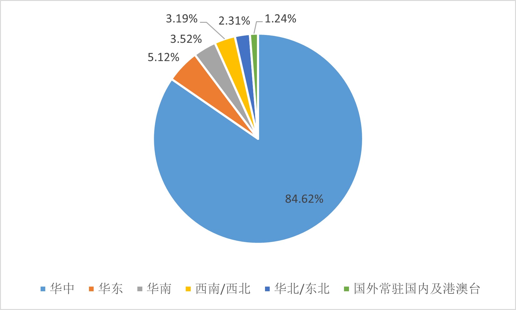 華中 84.62% 11569 華東 5.12% 701 華南 3.52% 481 西南/西北 3.19% 436 華北/東北 2.31% 316 國外常駐國內及港澳臺 1.24% 169