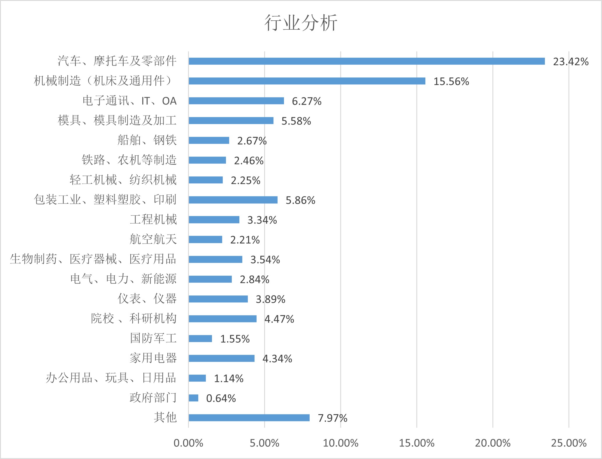 湖北省 67.41% 9216 湖南省 8.36% 1143 河南省 7.11% 972 江西省 3.56% 487 安徽省 3.13% 428 沿海地區(上海、江蘇、浙江、廣東) 5.97% 816 港澳臺及國外常駐國內 1.24% 169 其他 3.22% 441 2.觀眾所在行業 參觀展會的企業行業,以汽車、摩托車及零部件企業最多,占到總數的23.42%,其次為機械制造(機床及通用件),占15.56%。此外,電子通訊、模具、船舶、鋼鐵、鐵路、農機、輕工、橡塑包裝、工程機械、國防軍工、航空航天、生物醫藥、家電等制造行業均有涉及。