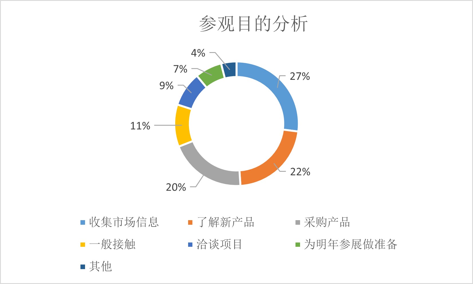 生產 25% 管理 22% 采購 18% 市場 13% 銷售 10% 研發 8% 其他 4% 4.參觀目的 專業觀眾的參觀目的有“收集市場信息”“了解新產品”“采購產品” “一般接觸”“洽談項目”“為明年參展做準備”,比重依次降低。