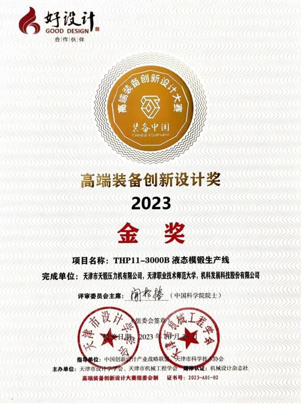 近日,2023中國工業設計工程大會在天津順利召開。天鍛公司聯合天津職業技術師范大學、機科發展科技股份有限公司完成的“THP11-3000B液態模鍛生產線”項目,榮獲2023年高端裝備創新設計大賽金獎。