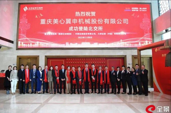 11月8日,重慶美心翼申機械股份有限公司在北京證券交易所正式掛牌上市。 本次公開發行股票數量為1200萬股(超額配售選擇權全額行使后為1380萬股),發行后總股本8056萬股(超額配售選擇權全額行使后為8236萬股),發行價格10元/股。