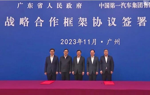 11月29日,中國一汽與廣東省政府在廣州簽署戰略合作框架協議。集團公司黨委書記、董事長邱現東與廣東省委副書記、省長王偉中舉行工作會談并見證協議簽署。廣東省委常委、副省長王曦,廣州市委副書記、代市長孫志洋參加活動。