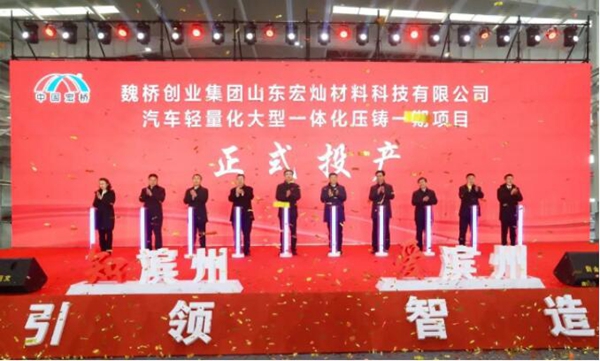 12月12日,山東宏燦材料科技有限公司汽車輕量化大型一體化壓鑄一期項目竣工投產儀式在惠民經濟技術開發區高端鋁產業園舉行。該項目是魏橋創業集團向高端裝備、智能制造企業轉型的關鍵一環,將依托魏橋創業集團產業基礎、先進材料等優勢,打造全國第一條“鋁水—壓鑄—裝備制造—回收利用”的全新綠色示范產業鏈,推動企業輕量化發展再邁新步伐。