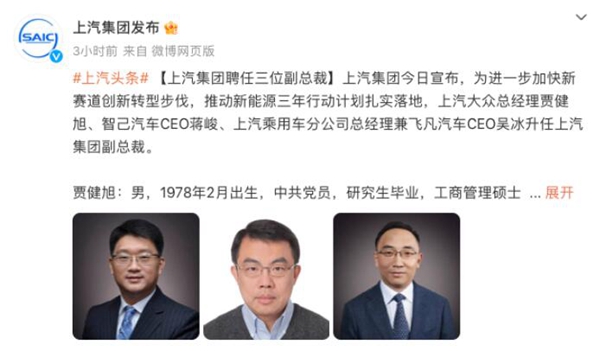 上汽集團(tuán)迎來重大人事調(diào)整。12月22日,上汽集團(tuán)宣布聘任三位副總裁:上汽大眾總經(jīng)理賈健旭、智己汽車CEO蔣峻、上汽乘用車分公司總經(jīng)理兼飛凡汽車CEO吳冰升任上汽集團(tuán)副總裁。
