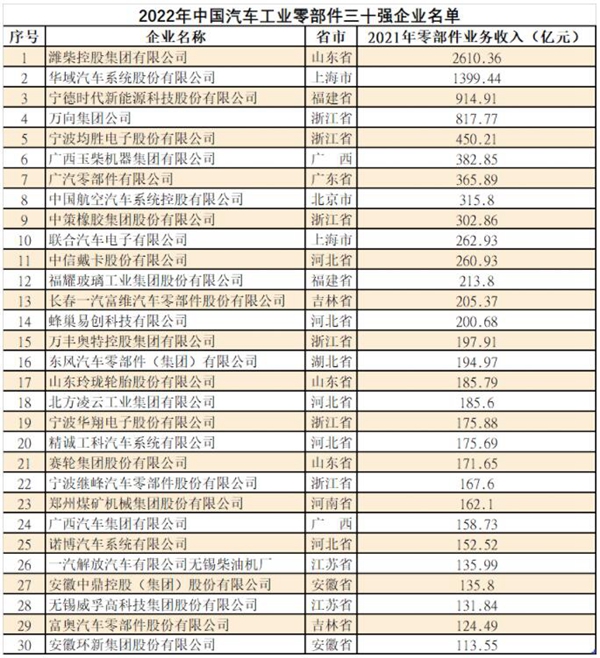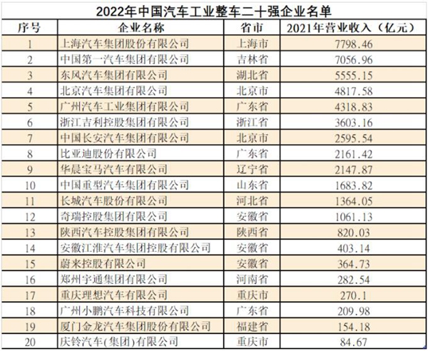 日前,中國機械工業聯合會對外發布了2022年汽車工業整車二十強、零部件三十強企業名單。上海汽車集團股份有限公司、中國第一汽車集團有限公司、東風汽車集團有限公司分別獲得2022年中國汽車工業整車二十強企業前三名;濰柴控股集團有限公司、華域汽車系統股份有限公司、寧德時代新能源科技股份有限公司分別獲得2022年中國汽車工業零部件三十強企業前三名。