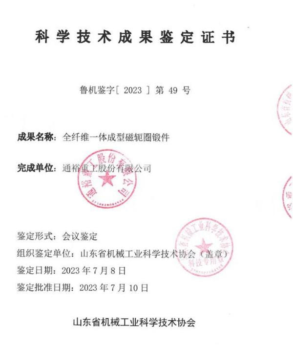 近日, 通裕重工股份有限公司委托山東省機械工業科學技術協會組織行業專家,采用線上會議的形式召開了“全纖維一體成型磁軛圏鍛件”科技成果鑒定會。