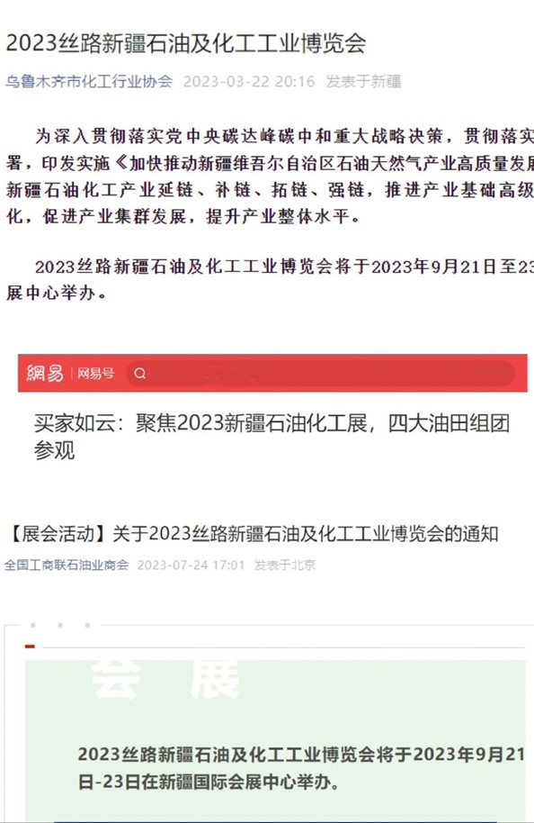 50000+專業觀眾 保證企業參展效果 展會現場,將有20多家新疆能源重化工產業園區,分別有新疆準東經濟開發區、奎屯—獨山子經濟技術開發區、克拉瑪依石油化工園區、新疆鄯善化工園區、甘泉堡經濟開發區、伊犁伊東工業園區等;500多家石油石化/天然氣、油氣管道、煤化工、鹽化工、氯堿、化肥工業等能源重化工企業,分別有新疆油田公司、塔里木油田公司、吐哈油田公司、烏魯木齊石化公司、獨山子石化公司、克拉瑪依石化公司、中石化西北油田公司、西部管道公司、中電投新疆能化、華能新疆能源公司、兗礦新疆能化、中泰化學等。100多家石油與化工設計院、工程承包商,分別有中石油工程設計公司、中石油工程建設公司、中石油管道設計院、中石油西部管道公司、中石化工程建設公司、中石化煉化工程公司、中國天辰工程公司、中國華泰工程公司等專業采購商組團參觀,參觀商可以飽覽各大企業的全新產品與創新技術,現場買家聚集現場,開拓中亞石油化工市場發展新商道。 政府部門、主流媒體、各大商會、協會高頻聚焦 多渠道宣傳推廣 自會議籌備至今,博覽會受到了政府部門、各大商會、協會和媒體行業廣泛關注,包括CCTV、人民日報、經濟日報、新華社、中國新聞社、中國日報、科技日報、新疆衛視、烏魯木齊電視臺、兵團衛視、新疆日報、烏魯木齊晚報、兵團日報、新疆都市報、中國石油新聞中心、奇臺縣人民政府、新疆維吾爾自治區石油和化學工業協會、國家級庫爾勒經濟技術開發區、中華全國工商業聯合會石油業商會、中國石化新聞網、中國能源網、泵閥制造網、網易、中國泵閥網、國聯、中國網、5G頭條、全球石油化工網、洛克斯石油網、能源界、中國石油和化工網、國家能源網、蓋德化工網、慧聰石油網等200余家權威媒體和行業媒體的關注,以下截圖為部分媒體報道。