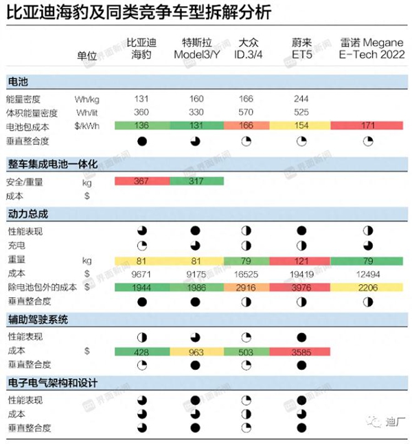 據瑞銀報告,比亞迪海豹中約75%的零部件是比亞迪自產,大量依賴中國的本土供應鏈,零部件的自產率要比特斯拉在美國生產、在中國生產或者大眾在德國生產都要更高,并具有成本競爭力,總體成本相比上海生產的同級別Model 3要低15%左右,比大眾汽車在歐洲生產的相似規格車型成本低35%。