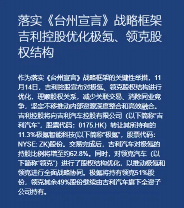 吉利旗下兩大品牌極氪與領(lǐng)克正式官宣合并。11月14日,吉利控股集團(tuán)宣布,作為落實(shí)《臺州宣言》戰(zhàn)略框架的關(guān)鍵性舉措,對極氪、領(lǐng)克股權(quán)結(jié)構(gòu)進(jìn)行優(yōu)化。吉利控股集團(tuán)將向吉利汽車控股有限公司轉(zhuǎn)讓其所持有的11.3%極氪股份。交易完成后,吉利汽車對極氪的持股比例將增至約62.8%。