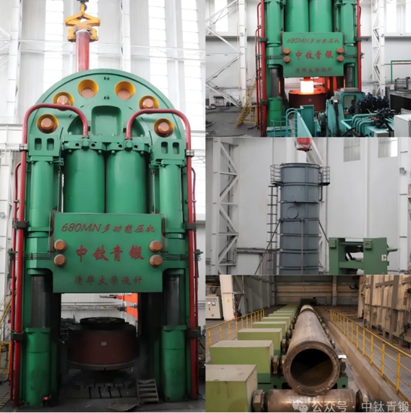 2024年11月12日上午,在中鈦青鍛 680MN 多功能壓機平臺上一根紅彤彤的超大尺寸316LN不銹鋼無縫管材徐徐吊出,然后快速進入冷卻水塔中,現(xiàn)場瞬間翻滾出大量的水汽,標志著本次超大口徑316LN不銹鋼無縫管材試制成功。