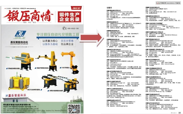 由中國鍛壓協會主辦的 《鍛壓商情—鍛件生產企業名錄》2024年開始修訂,最新修訂版計劃于2024年5月出刊,該刊采取線上鍛造網上展會展示和線下鍛造相關采購會議、展覽等發放推薦方式相結合,真正搭建起鍛件供采雙方的橋梁。