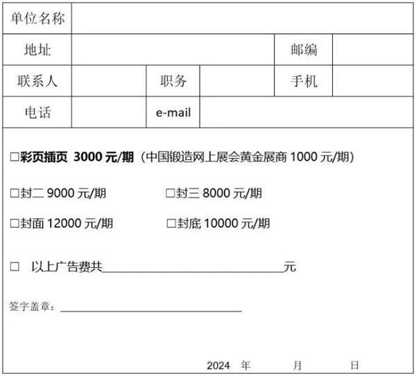 其中刊內可提供企業彩頁宣傳,是各優秀企業宣傳產品的理想途徑,歡迎有需要的企業踴躍刊登廣告,數量有限,先到先得。 ![]() 刊登咨詢 羅文會 女士 手機:13343131143(同微信)郵箱:luowenhui@chinaforge.org.cn 刊登廣告及信息回執單
