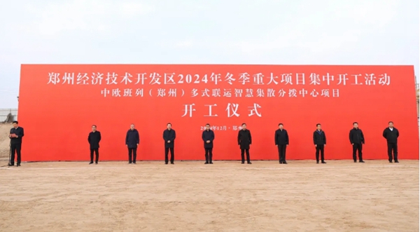 12月20日上午,鄭州經開區2024年冬季重大項目集中開工活動在中歐班列(鄭州)多式聯運智慧集散分撥中心項目舉行,集中開工10個重大項目,總投資達107億元。