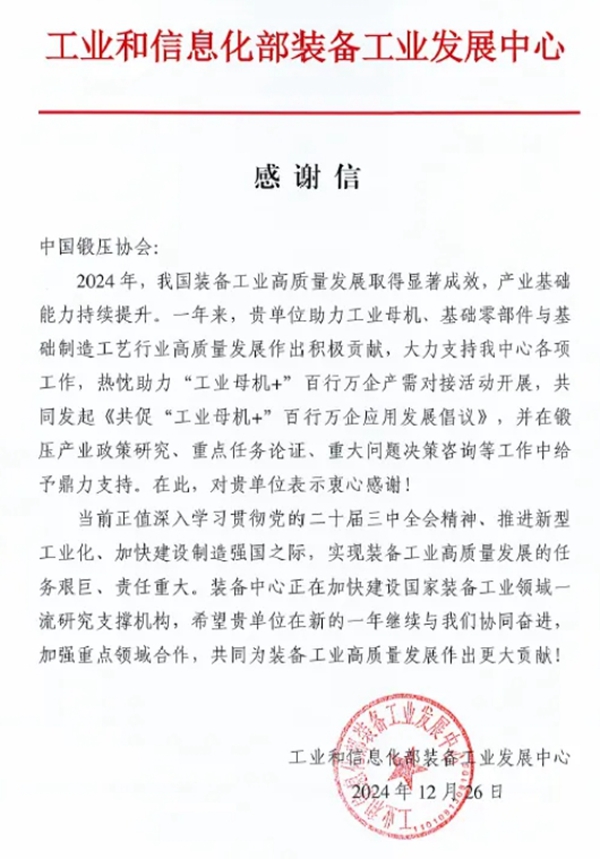 工信部裝備工業發展中心向中國鍛壓協會發來感謝信!