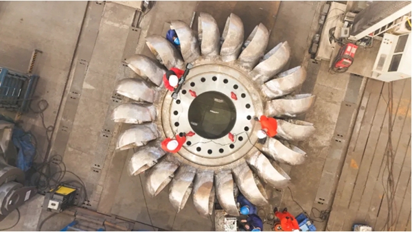 沖擊式水輪機是用壓力管道引導水流沖擊式轉輪進行能量轉換的水力機械,電站落差大、壓力高。扎拉電站設計水頭671米,轉輪是直接影響機組效率和最重要的受力部件及通流部件之一。在機組運行狀態下,時刻承受高頻率的動態壓力,對機組的穩定運行和安全起著至關重要的作用,焊接制造要求極為嚴苛。 作為世界單機容量最大沖擊式機組轉輪,其輪轂鍛件直徑尺寸為4.7米、厚度達1米,創造了馬氏體不銹鋼最大鍛件世界紀錄;加工后的轉輪最大外徑6.23米、最大寬度1.34米,也是沖擊式轉輪世界之最;且由于材質、型狀、尺寸等原因,焊接、加工等環節的制造技術,都處于相關領域的前沿,探索制造的過程,存在很多風險因素和不確定性,焊接制造要求極高、難度極大。