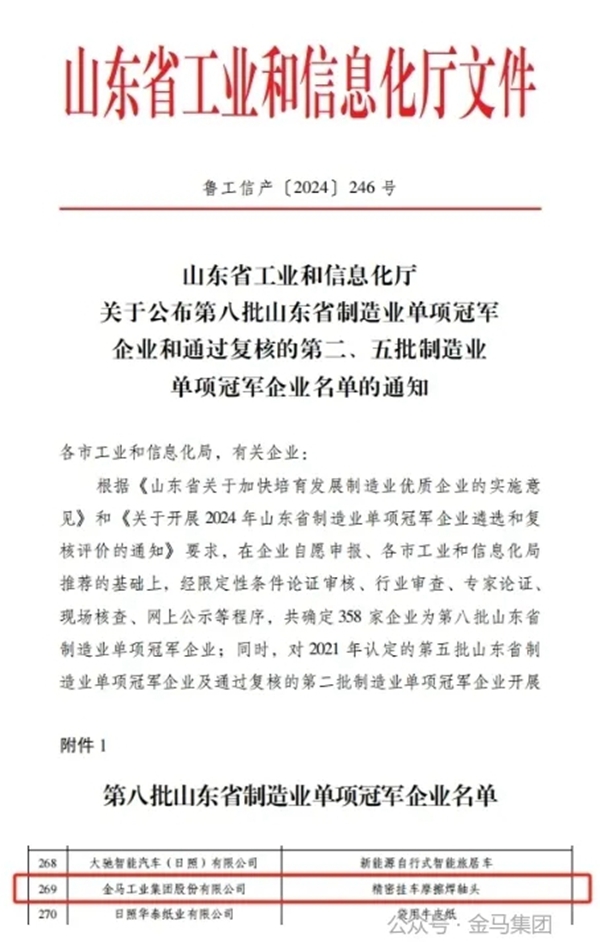 近日,山東省工業和信息化廳發布《關于公布第八批山東省制造業單項冠軍企業和通過復核的第二、五批制造業單項冠軍企業名單的通知》,金馬工業集團憑借“精密掛車摩擦焊軸頭”產品成功入選,這是集團在獲得1個國家制造業單項冠軍,3個省制造業單項冠軍后,獲得的第5個制造業單項冠軍。