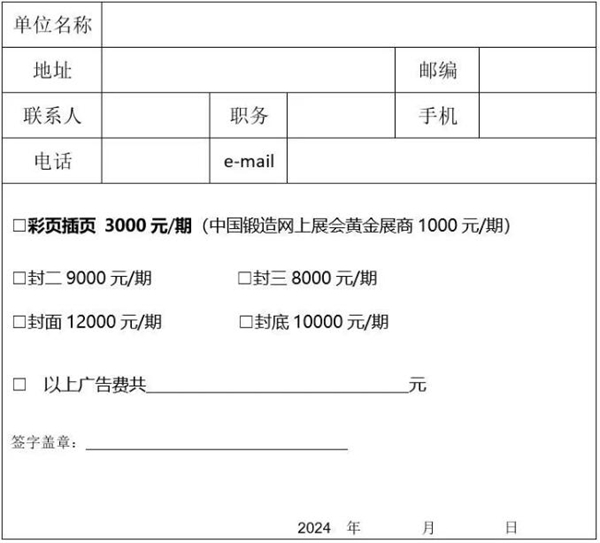 刊登咨詢 羅文會 女士 手機:13343131143(同微信) 郵箱:luowenhui@chinaforge.org.cn 刊登廣告及信息回執(zhí)單