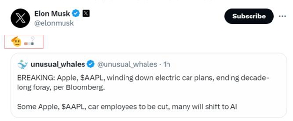 蘋果于當地時間2月27日在內部披露這一消息,令參與該項目的近2000名員工感到意外,首席運營官Jeff Williams和負責這項工作的副總裁Kevin Lynch共同做出了這一決定。 兩位高管告訴員工,該項目將開始逐步結束,負責汽車的團隊中的許多員工將被轉移到執行官John Giannandrea領導的人工智能部門,這些員工將專注于生成式人工智能項目,這是公司越來越關鍵的優先事項。蘋果汽車團隊還擁有數百名硬件工程師和汽車設計師,他們有可能申請其他Apple團隊的工作。 另據報道,蘋果公司將會裁員,但目前還不清楚裁員人數。 蘋果對上述消息拒絕置評。 與此同時,面對潛在的競爭對手退出賽道,馬斯克在社交平臺上發了兩個表情,置評蘋果取消造車計劃。