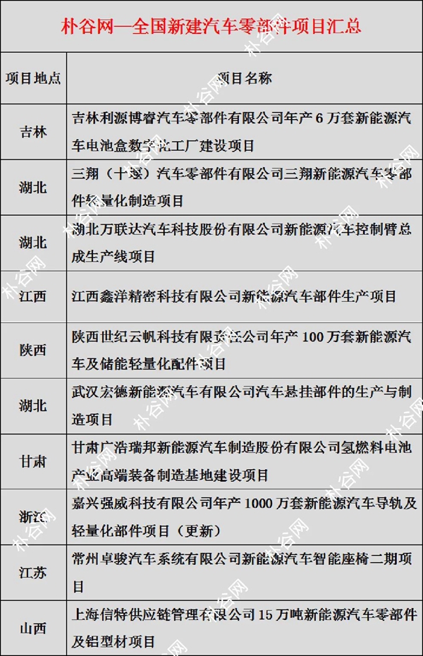 日前,樸谷網(wǎng)發(fā)布全國(guó)新建汽車(chē)零部件項(xiàng)目匯總,詳細(xì)列表如下: