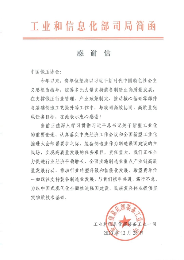 工信部裝備工業一司向中國鍛壓協會發來感謝信