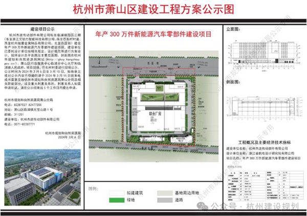 日前,杭州市規劃和自然資源局蕭山分局公示《杭州市蕭山區年產300萬件新能源汽車零部件建設項目》相關內容。