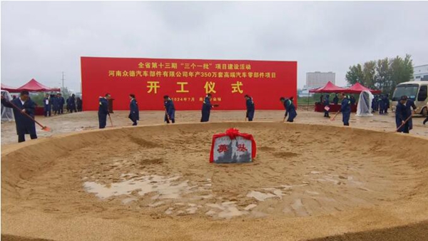 7月11日,河南省全省第十三期“三個一批”項目建設活動—河南眾德汽車部件有限公司年產350萬套高端汽車零部件項目開工儀式在臥龍區舉行。市委副書記、市長王智慧宣布項目開工。