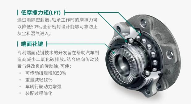 帶端面花鍵的輪轂軸承是舍弗勒輪轂軸承產(chǎn)品系列中的核心產(chǎn)品。得益于端面花鍵專利技術(shù)和低阻力設計,該軸承在摩擦、扭矩傳遞、輕量化、能耗等方面均有出色表現(xiàn)。與普通設計相比,帶端面花鍵的輪轂軸承傳遞的扭矩增加50%,重量減輕10%,摩擦降低34%,可使整車能耗降低0.6%。