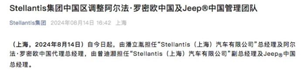 8月14日,Stellantis集團官方宣布,即日起,由潘立胤擔任“Stellantis(上海)汽車有限公司”總經理及阿爾法·羅密歐中國代理總經理,由曾迪灝擔任“Stellantis(上海)汽車有限公司”副總經理及Jeep中國總經理。