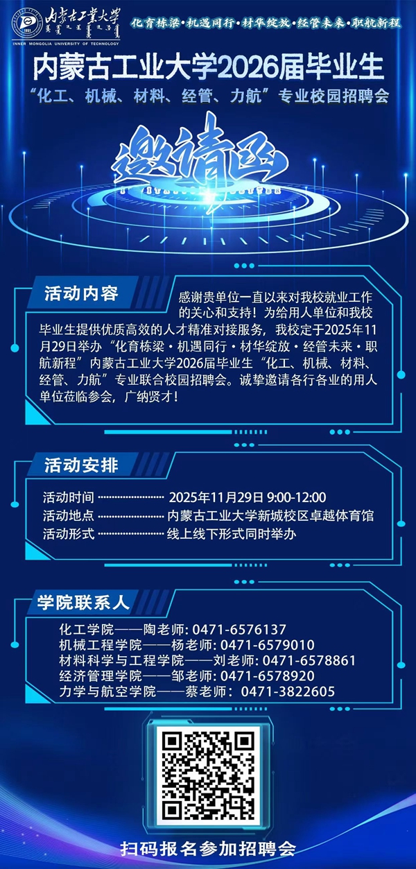 邀請函 | 內(nèi)蒙古工業(yè)大學2026屆畢業(yè)生“化工、機械、材料、經(jīng)管、力航”專業(yè)校園招聘會