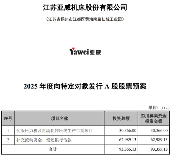 揚(yáng)州產(chǎn)發(fā)集團(tuán)擬以現(xiàn)金方式認(rèn)購(gòu)亞威股份本次發(fā)行的全部128235074股A股股票,發(fā)行數(shù)量不超過(guò)本次發(fā)行前公司總股本的30.00%,發(fā)行價(jià)格為7.28元,預(yù)計(jì)募集資金9.34億元,募集資金主要用于伺服壓力機(jī)及自動(dòng)化沖壓線生產(chǎn)二期項(xiàng)目建設(shè);補(bǔ)充流動(dòng)資金、償還銀行借款。2025年1月20日,亞威股份已與揚(yáng)州產(chǎn)發(fā)集團(tuán)簽署了《股份認(rèn)購(gòu)協(xié)議》。