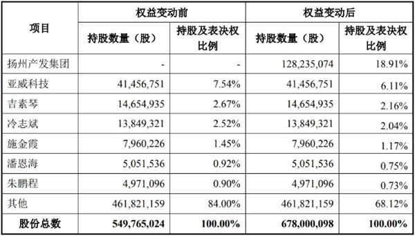 假設(shè)自本次發(fā)行董事會(huì)決議公告日至發(fā)行日公司總股本不變,本次發(fā)行完成后,揚(yáng)州產(chǎn)發(fā)集團(tuán)通過(guò)認(rèn)購(gòu)上市公司向特定對(duì)象發(fā)行股票的方式,將持有亞威股份 128235074股股票,占發(fā)行完成后上市公司股份的比例為18.91%(剔除回購(gòu)專用證券賬戶股份數(shù)量影響,占比為19.09%)。 根據(jù)2025年1月20日揚(yáng)州產(chǎn)發(fā)集團(tuán)與亞威股份主要股東亞威科技、吉素琴、冷志斌、施金霞、潘恩海、朱鵬程簽訂的《合作框架協(xié)議》,本次發(fā)行完成后,將對(duì)亞威股份董事會(huì)進(jìn)行改組,改組后的董事會(huì)人數(shù)仍為9名,其中揚(yáng)州產(chǎn)發(fā)集團(tuán)有權(quán)提名或推薦5名非獨(dú)立董事和2名獨(dú)立董事候選人。