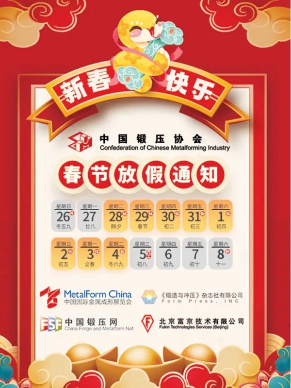 中國(guó)鍛壓協(xié)會(huì)秘書處放假安排1月28日-2月4日放假。 1月26日、2月8日(周六)上班節(jié)日期間值班電話:13021030344。敬請(qǐng)聯(lián)系。 在充滿挑戰(zhàn)與機(jī)遇的2024年,在廣大行業(yè)同仁的關(guān)注與支持下,中國(guó)鍛壓協(xié)會(huì)系統(tǒng)圓滿完成各項(xiàng)工作。 值此新春佳節(jié)到來(lái)之際 中國(guó)鍛壓協(xié)會(huì)秘書處 北京富京技術(shù)有限公司 《鍛造與沖壓》雜志社有限公司 中鍛智能裝備設(shè)計(jì)院(青島)有限公司 國(guó)開金聯(lián)供應(yīng)鏈管理(北京)有限公司 全體工作人員恭祝大家:所營(yíng)皆昌盛 所愿皆成真!來(lái)源:中國(guó)鍛壓協(xié)會(huì)服務(wù)平臺(tái) 編輯:陳亞男 審核:李建兵 |