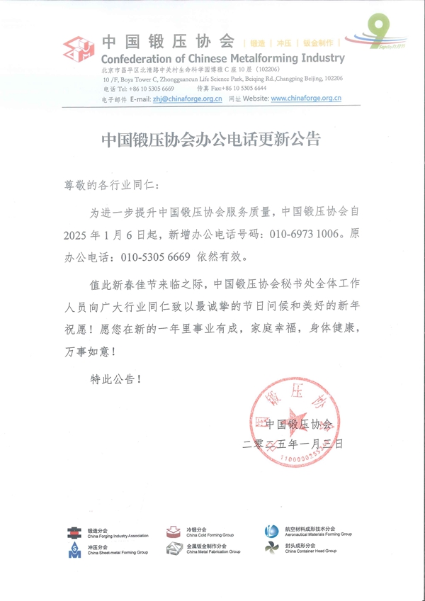 尊敬的各行業同仁: 為進一步提升中國鍛壓協會服務質量,中國鍛壓協會自2025年1月6日起,新增辦公電話號碼:010-6973 1006。原辦公電話:010-5305 6669 依然有效。 值此新春佳節來臨之際,中國鍛壓協會秘書處全體工作人員向廣大行業同仁致以最誠摯的節日問候和美好的新年祝愿!愿您在新的一年里事業有成,家庭幸福,身體健康,萬事如意! 特此公告! 中國鍛壓協會 二零二五年一月三日