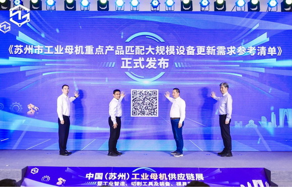 開幕式上,蘇州市工信局攜手市發改委、科技局、人社局四部門聯合發布了《蘇州市工業母機重點產品匹配大規模設備更新需求參考清單》,精選了139家工業母機企業的456只重點產品,旨在發揮蘇州市在工業母機領域的技術優勢,助力蘇州制造的大規模設備更新;出席開幕式的嘉賓有:蘇州市人民政府副秘書長吳旭翔,中國機械工業聯合會黨委常委楊學桐會長,中國機床總公司黨委書記總經理李杜娟,中國機械工業金屬切削刀具技術協會常務副理事長商宏謨,江蘇省模具行業協會執行會長總經理侍賢君,蘇州市發改委四級調研員聞龍根,蘇州市科技局副局長劉俊、蘇州市工業和信息化局副局長張文彪,蘇州市人社局副局長熊賢達,蘇州蘭普林特會展服務有限公司執行總經理楊濤先生,紐威數控裝備(蘇州)股份有限公司銷售總經理董松濤等領導出席了開幕式并共同為蘇州工業母機供應鏈展會啟幕。