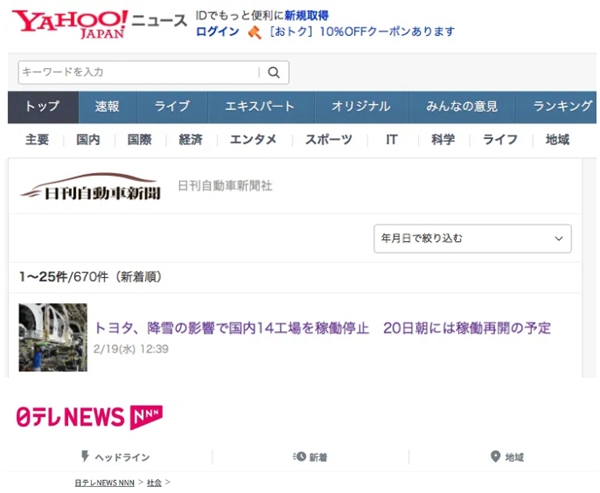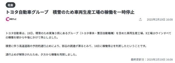 據《日經新聞》等多家媒體報道,2月19日,日本汽車廠商豐田汽車宣布,因降雪造成高速公路堵塞,豐田汽車在日本的14家工廠停產。報道顯示,從當天上午起暫停日本10家工廠和共計20條生產線的運營將在當天傍晚恢復運營,另有4家工廠和共計6條生產線將暫停運營,并將在2月20日上午恢復正常運營。